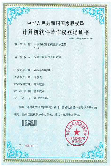 根據(jù)《計(jì)算機(jī)軟件保護(hù)條例》和《計(jì)算機(jī)軟件著作權(quán)登記辦法》的規(guī)定,經(jīng)中國(guó)版權(quán)保護(hù)中心審核,我公司EYHG智能照明控制柜控制系統(tǒng)和EYRC智能弧光保護(hù)系統(tǒng)近日取得中華人民共和國(guó)國(guó)家版權(quán)局計(jì)算機(jī)軟件著作權(quán)登記證書。