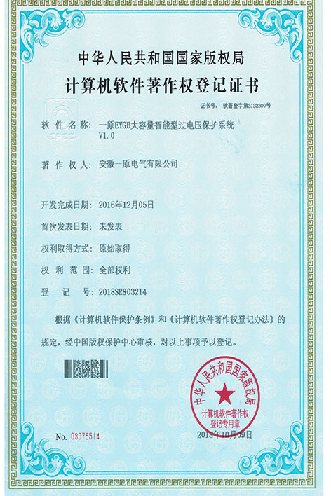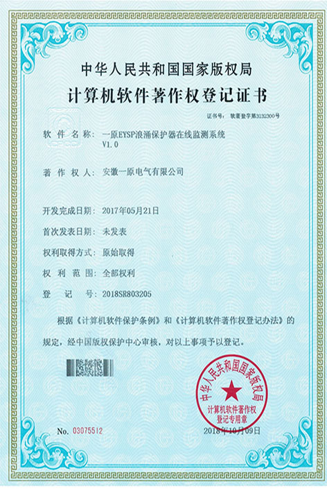 根據(jù)《計(jì)算機(jī)軟件保護(hù)條例》和《計(jì)算機(jī)軟件著作權(quán)登記辦法》的規(guī)定,經(jīng)中國(guó)版權(quán)保護(hù)中心審核,我公司EYSP浪涌保護(hù)器在線監(jiān)測(cè)系統(tǒng)和EYGB大容量智能型過(guò)電壓保護(hù)系統(tǒng)近日取得-中華人民共和國(guó)國(guó)家版權(quán)局計(jì)算機(jī)軟件著作權(quán)登記證書。